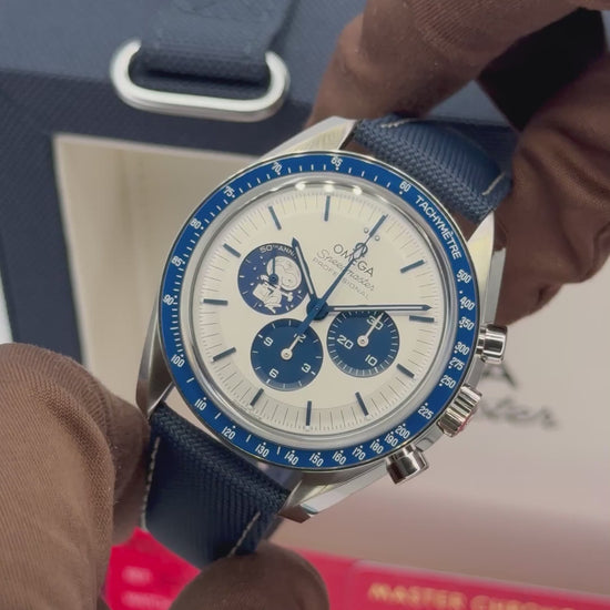 NEW 2025 Omega Speedmaster 42mm "Silver Snoopy Award" 50th Anniversary 310.32.42.50.02.001 Stainless Steel on Blue Nylon Fabric Strap