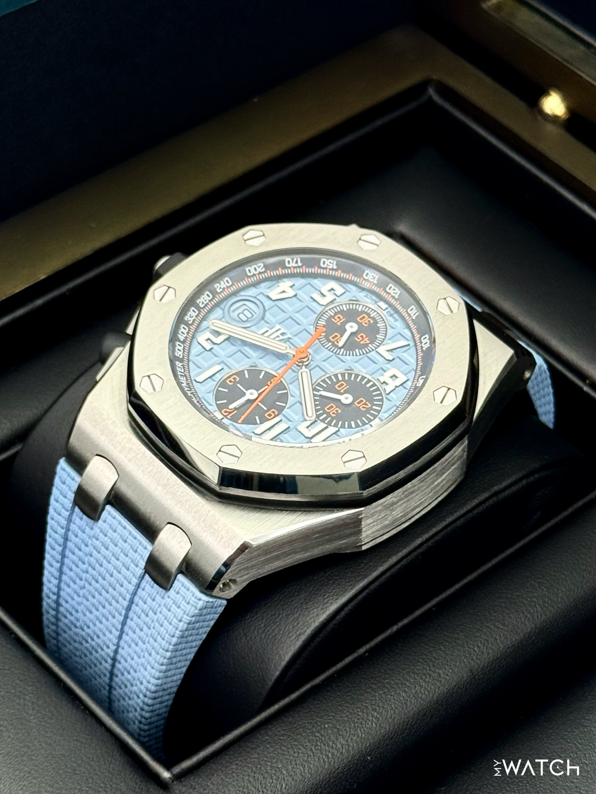 2023 Audemars Piguet Royal Oak Offshore Chronograph 42mm 26238ST.OO.A340CA.01 Stainless Steel Blue “Méga Tapisserie" dial contrasted with black counters