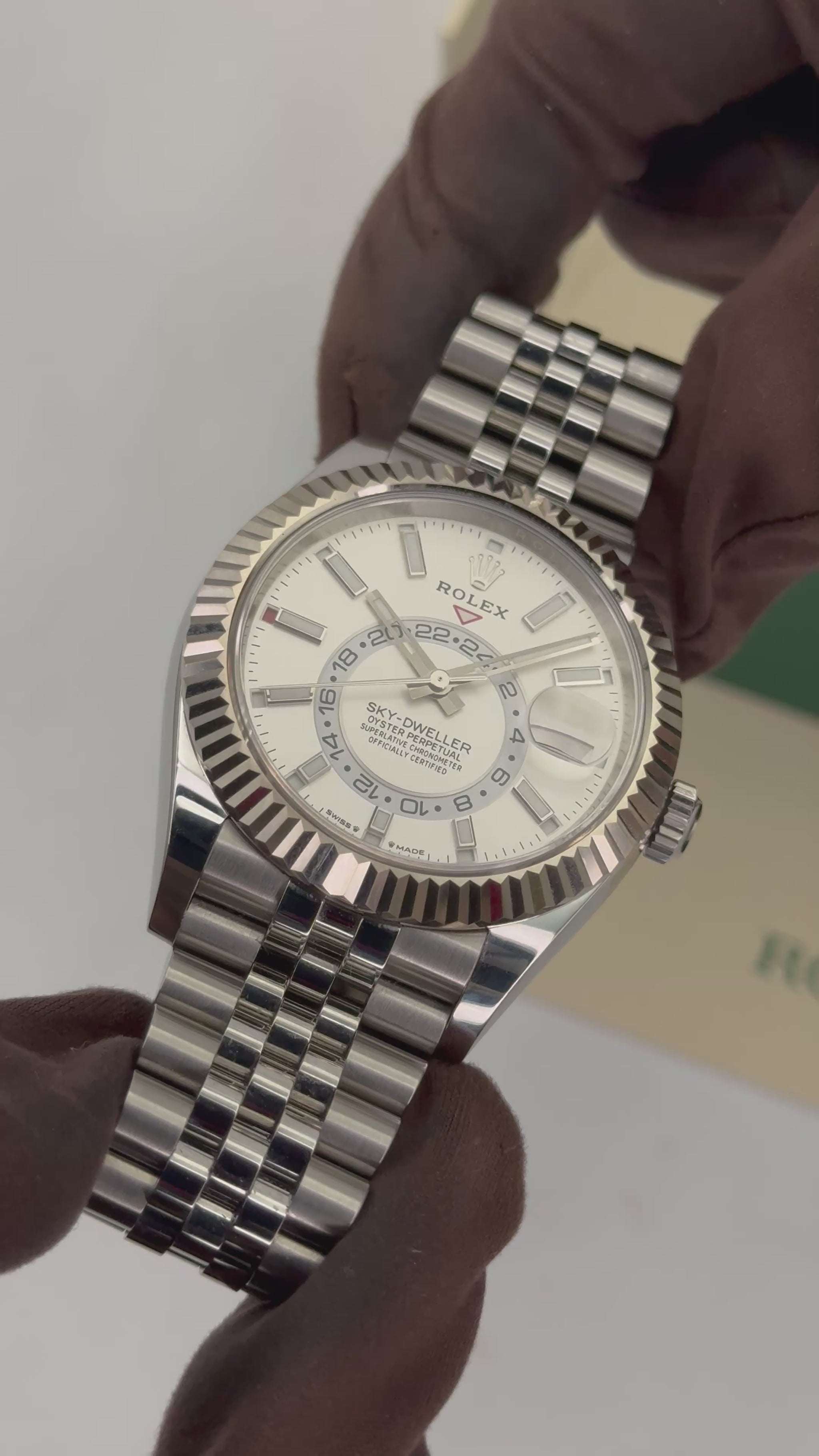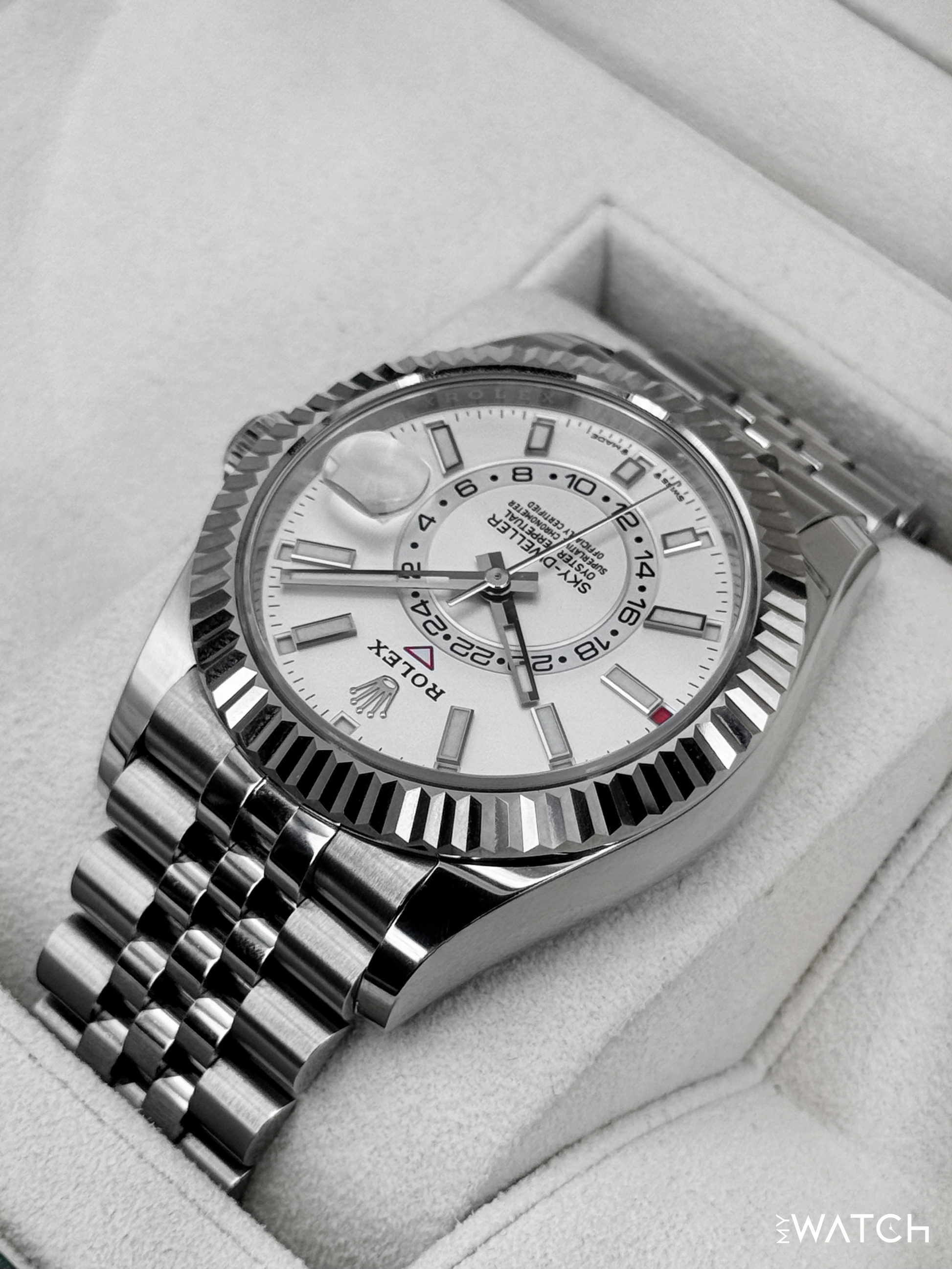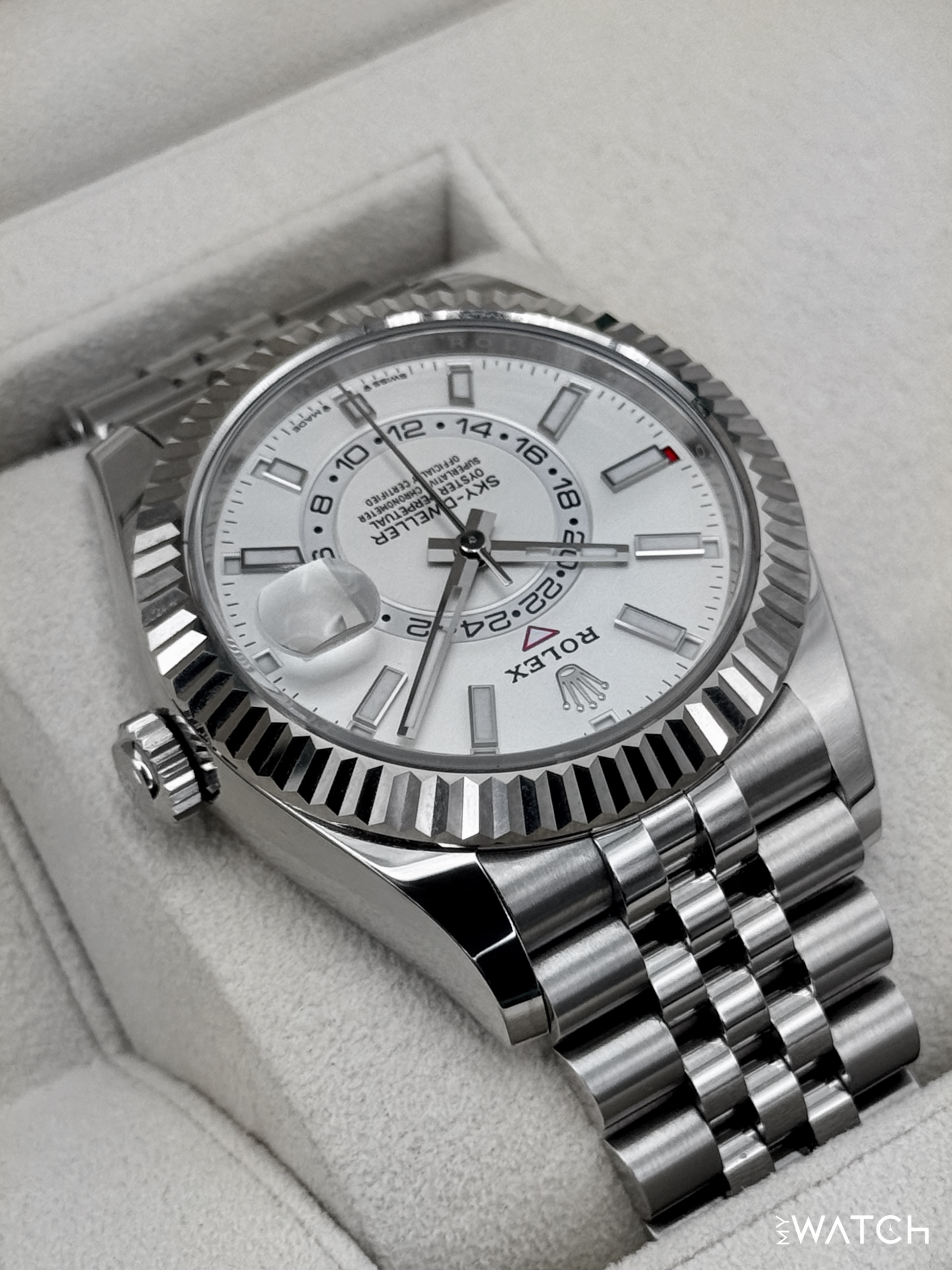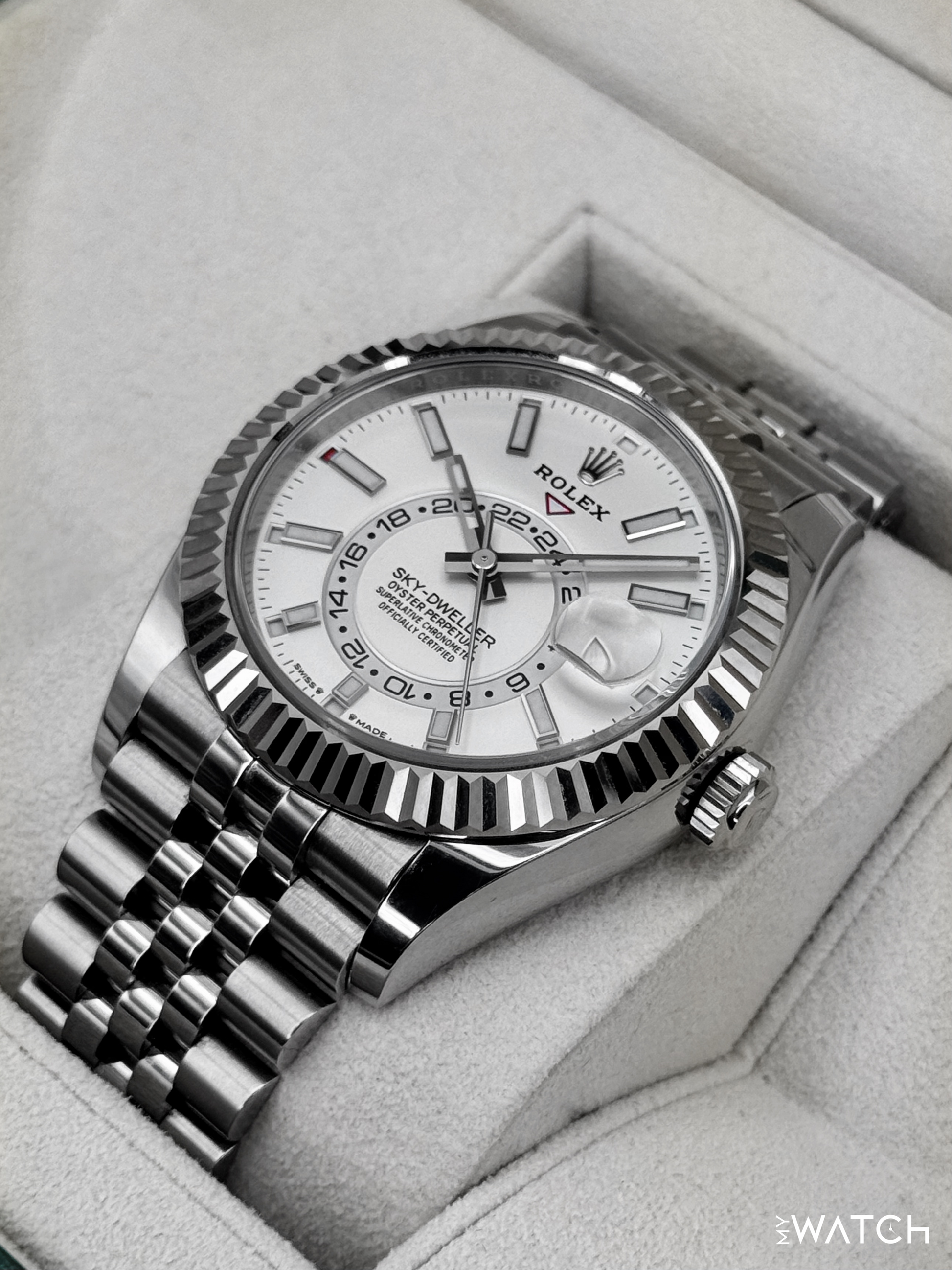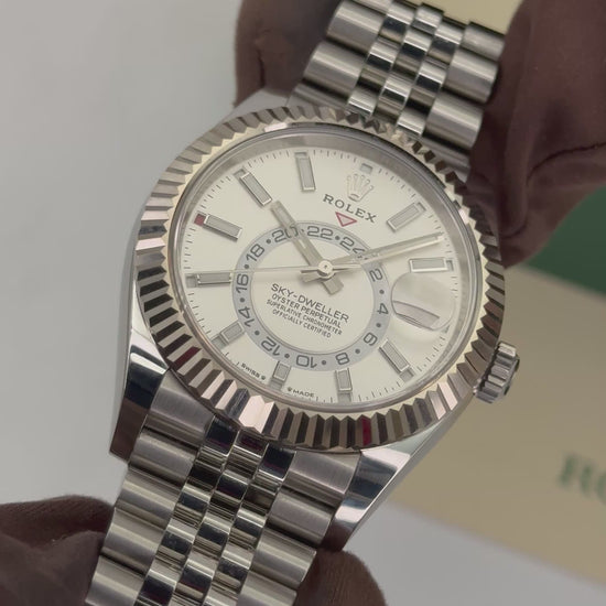 2023 Rolex Sky-Dweller 42mm 336934 Oystersteel and 18kt White Gold Fluted Bezel Jubilee Bracelet White Dial