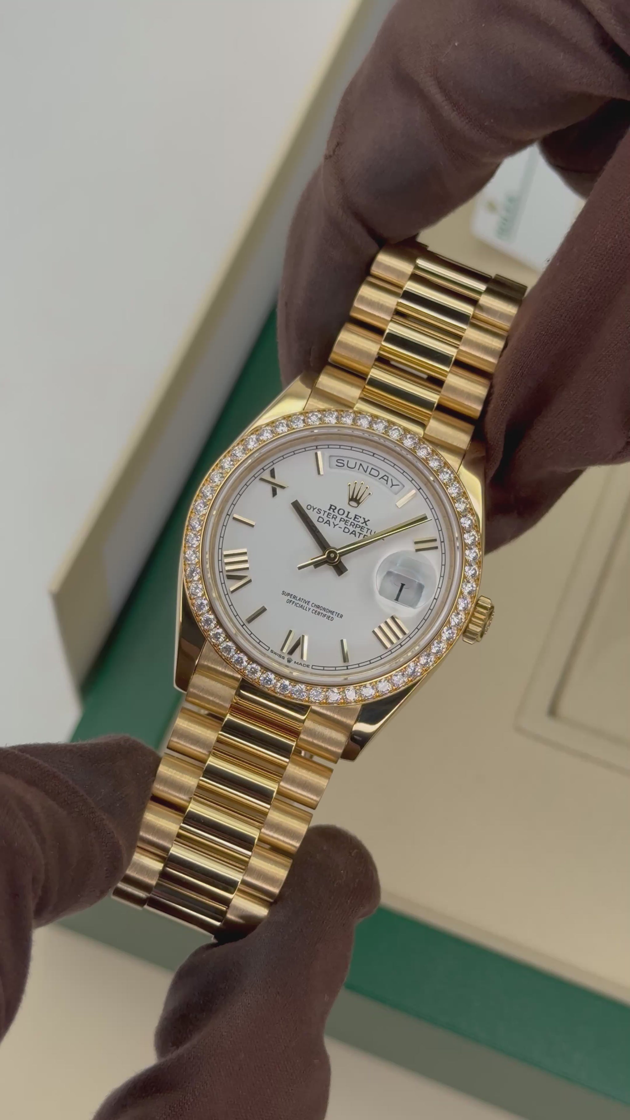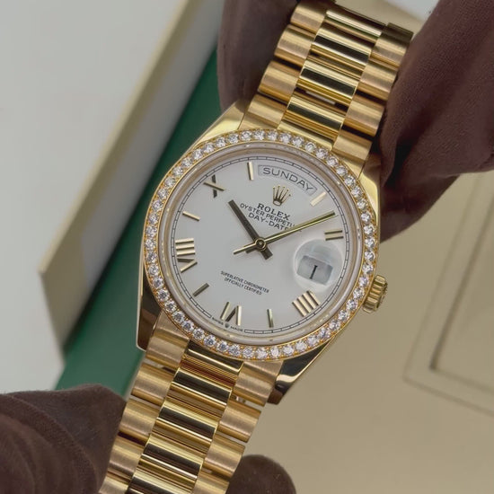 2024Rolex Day-Date 36mm 128348RBR 18kt Yellow Gold Presidential Bracelet White Roman Numeral Dial with Diamond Set Bezel
